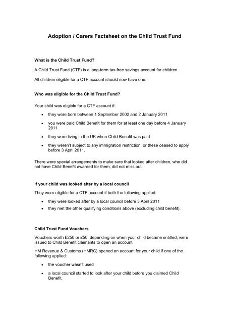 Adoption Carers Factsheet On The Child Trust Fund Hm Revenue